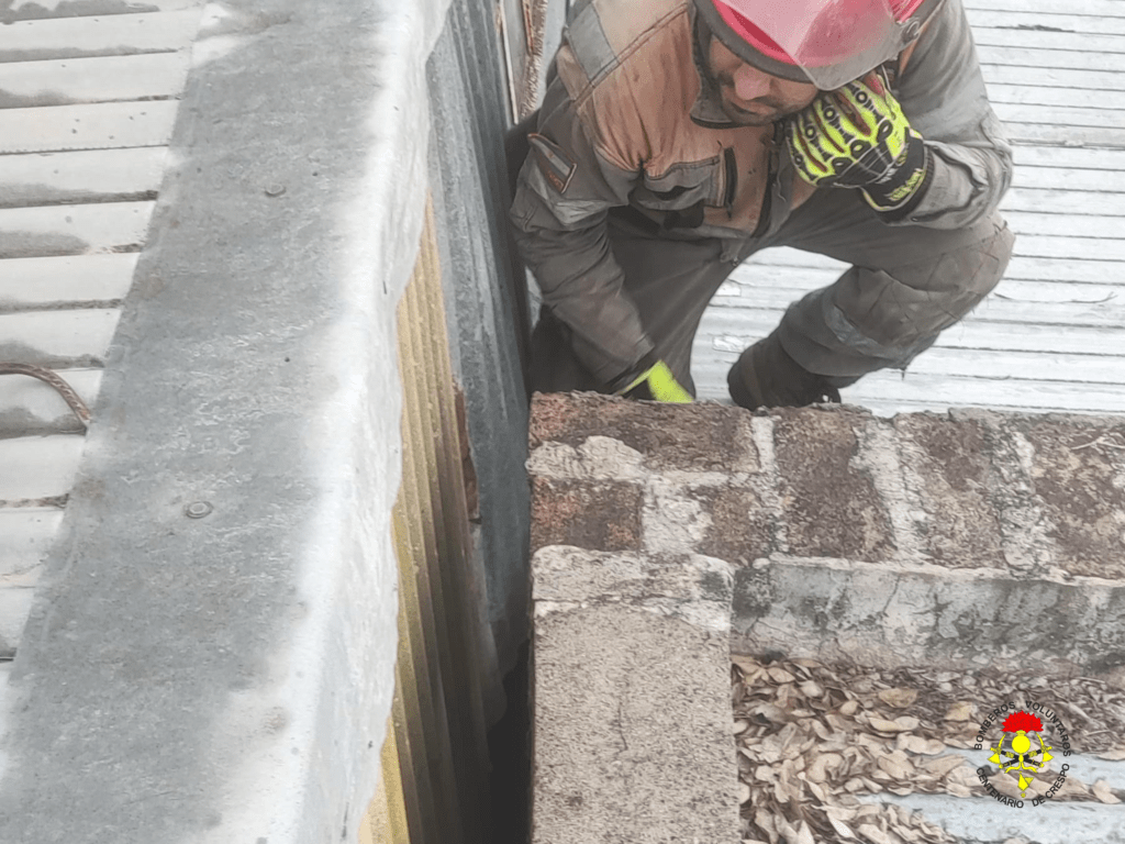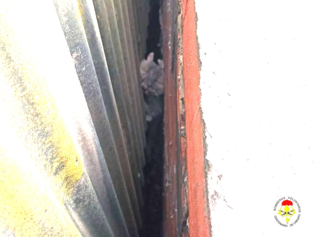 Desde las 17:45 a 18:30 hs se trabajó en el rescate de un felino que había caído en un pequeño espacio entre una pared común y una pared de chapas, pertenecientes a un galpón aledaño.