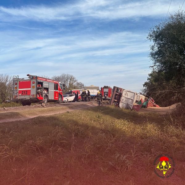 Al arribo de la primera dotación constata que este transportaba granos, el cual había volcado el chasis con acoplado sobre su lateral derecho, dejando al conductor del rodado (29) con una de sus extremidades inferiores atrapada en la cabina.