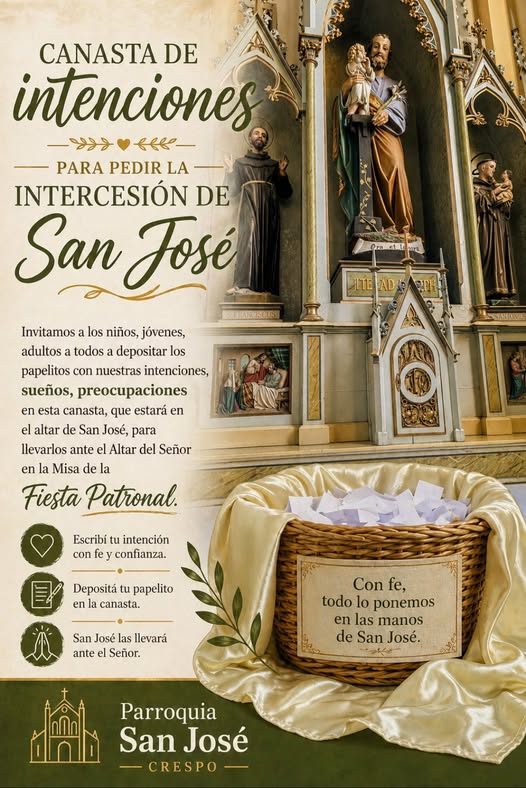 Invitamos a los niños, jóvenes, adultos, a todos … a depositar los papelitos con nuestras intenciones, sueños, preocupaciones en esta canasta, que estará en el altar de San José, para llevarlos ante el Altar del Señor en la Misa de la Fiesta Patronal.