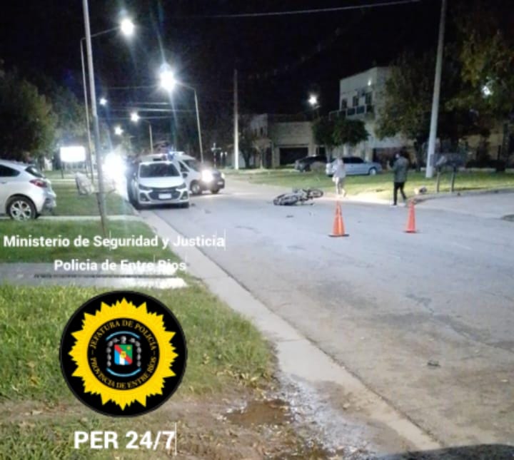 En 1 de mayo en horas cercanas a las 21 hs. Personal policial de Comisaría Crespo tomó conocimiento que en calle Carbo metros antes de su similar Dorrego se habría producido una colisión entre un automóvil y un moto vehículo. Una vez en el lugar pudieron observar que una moto 110 cc. conducida por un masculino mayor de edad, por motivos que se tratan de establecer habría colisionado un vehículo marca Chevrolet modelo Cruze, el cual se encontraba estacionado sobre la primera arteria de nombrada.