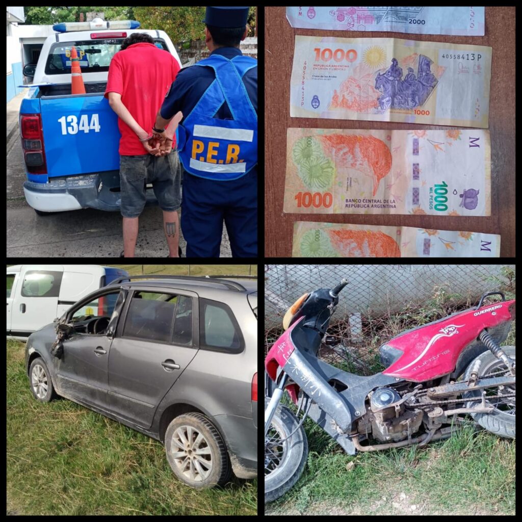 HECHO: se recibe un llamado telefónico a la oficina de guardia alertando que un masculino había ingresado a una granja zona 1 de mayo y ruta 12 y estaba hurtando elementos dentro de un vehículo, y que el mismo estaba reducido por dos empleados del lugar, al llegar la presencia policial proceden a la aprehensión y traslado del masculino. Se secuestro en el lugar la suma de $ 16.000,00 pesos. En comunicación con la Fiscal de la Unidad de Inv. y Litigación en turno, Dra. Mercedes Nin, una vez puesta en conocimiento, ordeno que se traslade al masculino a tribunales por el Sup. Delito de Hurto en Flagrancia. Además se retiene un auto y una moto propiedad de la persona detenida, por carecer de Documental.