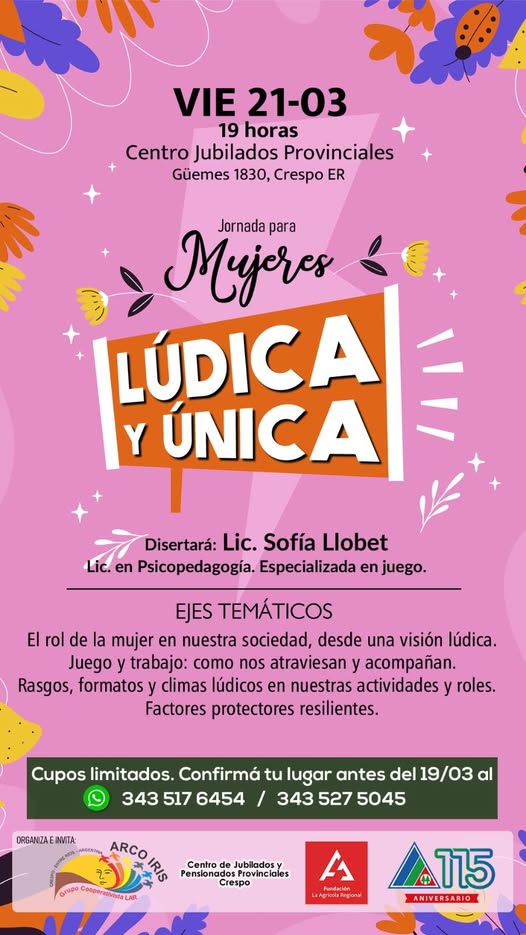 El 21 de marzo a las 18:30, será para jubiladas y pensionadas a compartir una jornada distinta para valorizar el rol de la mujer desde una visión lúdica, donde el juego será el protagonista de este encuentro.