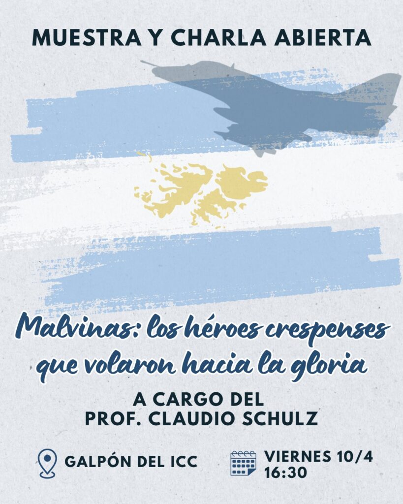 Se invita a esta muestra y charla abierta a cargo del Prof. Claudio Schulz. Se trata de un trabajo de investigación histórica que comenzó hace aproximadamente seis años, y que tiene como finalidad reconstruir la historia de los héroes locales Juan José Falconier y Danilo Rubén Bolzán, con el fin de enseñar a los chicos y al público en general sobre su actuación en la gesta de Malvinas.