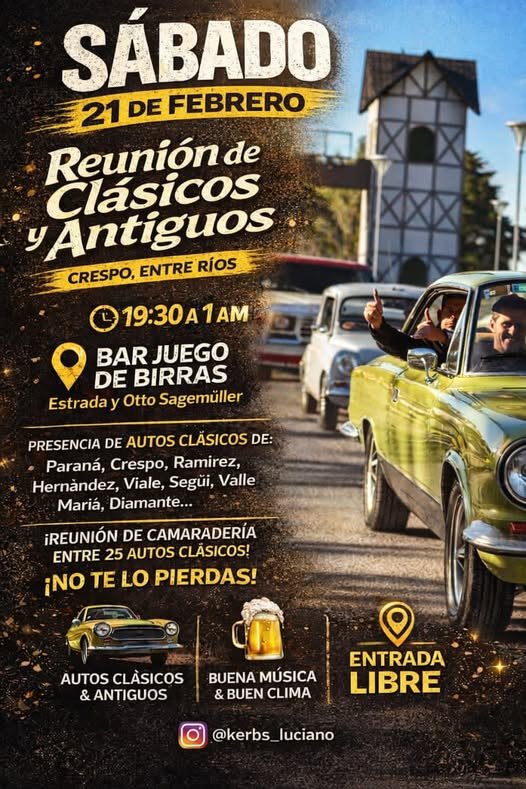 La ciudad de Crespo será escenario de una reunión de autos clásicos y antiguos, una propuesta que convoca a amantes de los vehículos históricos y al público en general a compartir una noche de camaradería y encuentro.