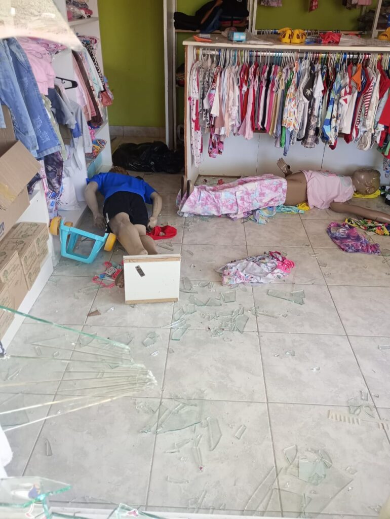 Mirna, la propietaria del domicilio y local nos contó que » estaba en el comedor de mi casa, tengo mi comercio rubro tienda pegado a mi domicilio. Escucho un estruendo, como que cayeron vidrios. Al principio, pensé que era el espejo que tengo el probador. Pensé que un auto me choco la tienda, cuando entre esta el ciervo Axis metido en el probador, alto, grande, cerré la puerta corrediza, para que no se metiera a mi casa. Salí y los vecinos me dijeron que se había ido solo, lo llame a mi marido, una vecina llamó a la GUM, a la policía, lo vieron lastimado en el arroyo, había sangre en la puerta, probador. Me dijeron que estaba muerto, tuve muchos daños materiales. A la tienda la tengo hace 5 años, empecé con muy poquito, de abajo, me mancho ropa, los dedos de los maniquíes se rompieron. Hubo gente que vio varios ciervos juntos. Que peligro si había gente adentro, llego una señora con 2 pequeños 5 minutos después, o si hay chicos jugando, no se que son capaces de hacer esos bichos.»