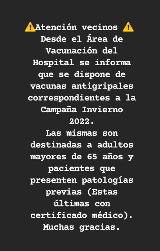 Se informa desde el área de vacunación del Hospital que se dispone de vacunas antigripales correspondientes a la Campaña Invierno 2022.