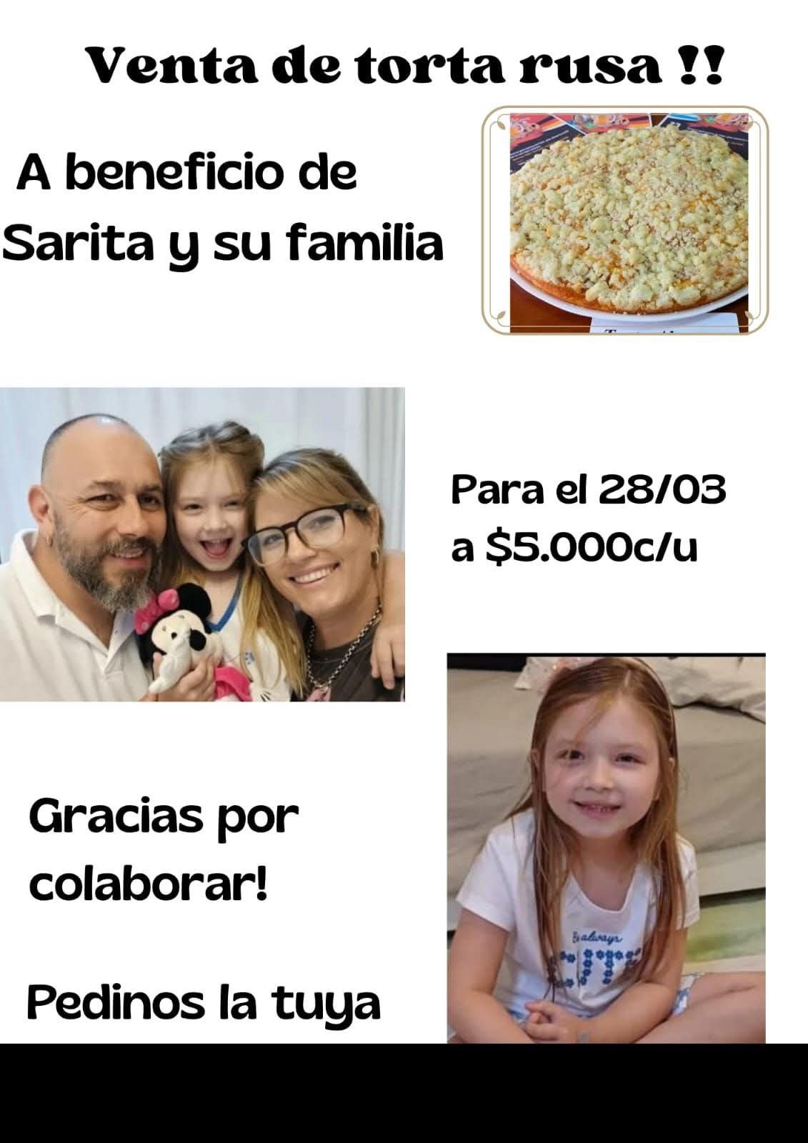 TODOS POR SARITA!!! Flavia Sanero en redes, esta levantado pedidos de torta rusa. Si alguien quiere colaborar le escribe por redes.